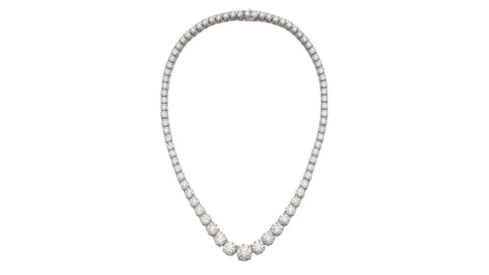 Это ожерелье в стиле «ривьера» оценивается в 125 000 долларов. Оно украшено 75 градуированными круглыми бриллиантами общим весом 39,89 карата, цвета от J до K и чистоты от VVS2 до SI2: