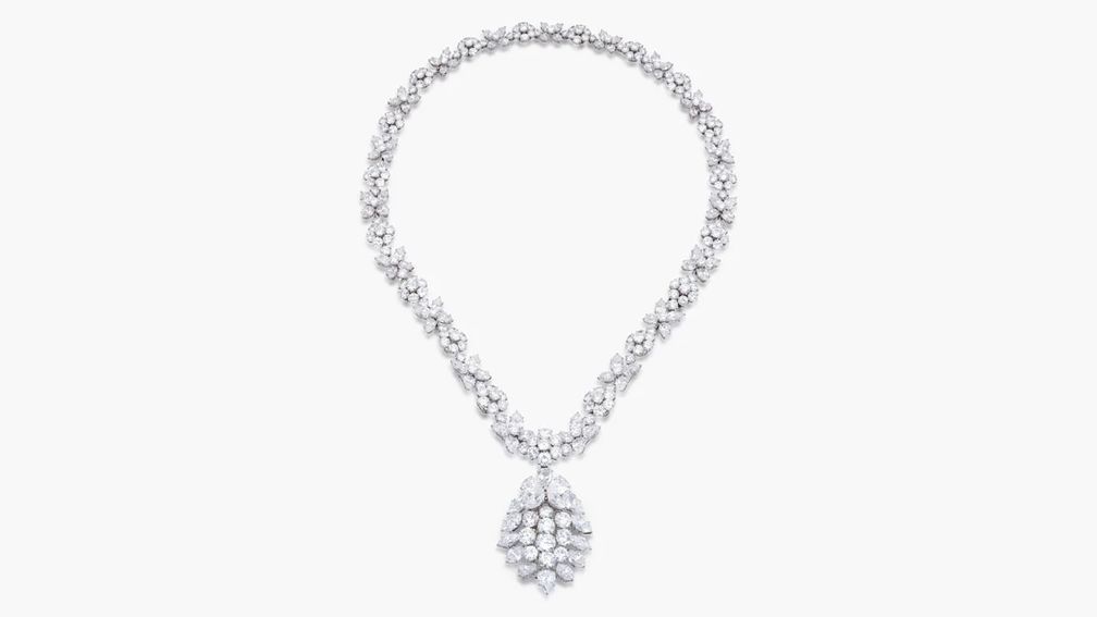 Колье Van Cleef & Arpels со съемной подвеской, которую можно носить как брошь, выполненную в виде кластера бриллиантов грушевидной огранки и огранки маркиз.