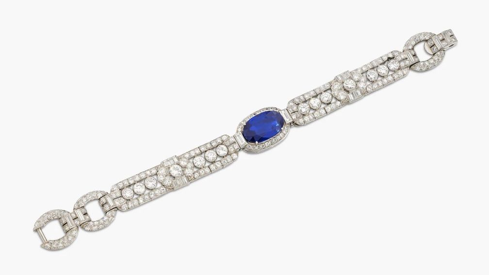 Браслет Cartier, изготовленный примерно в 1950 году, украшен овальным кашмирским сапфиром весом 7,04 карата, окаймленным бриллиантами.