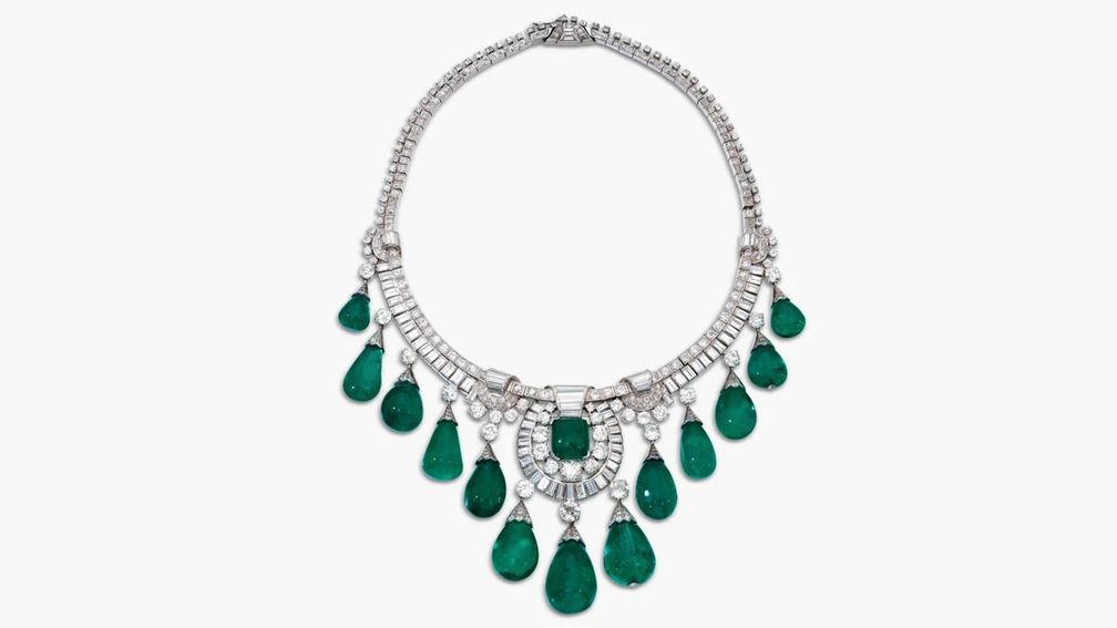 Колье с градуированной бахромой из 13 каплевидных колумбийских изумрудов весом от 11,38 до 57,52 карата, в центре которой находится изумруд-кабошон весом 11,56 карата в оправе из бриллиантов.