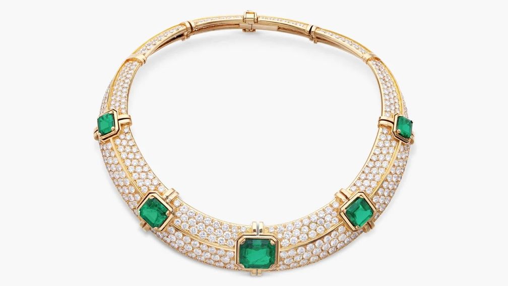 Колье Bucherer с пятью колумбийскими изумрудами ступенчатой огранки, весом от 3,08 до 13,24 карата, инкрустированными бриллиантами бриллиантовой огранки.