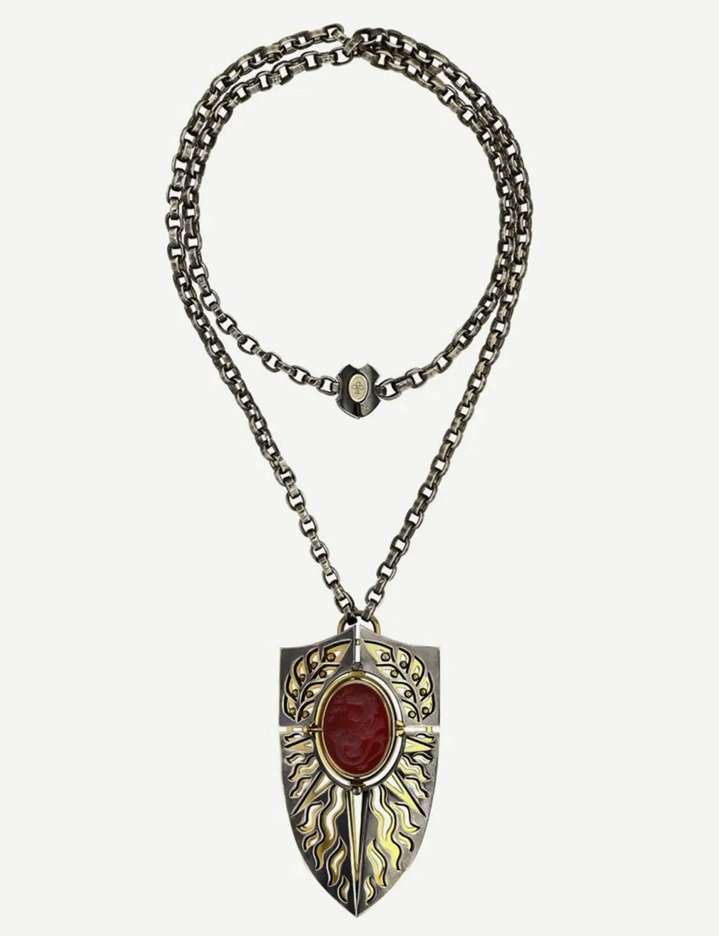 Ожерелье Bouclier Feu из гравированного желтого золота и патинированного серебра, бриллиантов и гравированного сердолика: