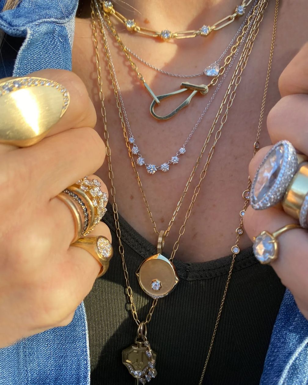 Однако небрежный образ подходит не всем, говорит дизайнер Дженна Гросфельд. «Я люблю смешивать текстуры, узоры, цвета и формы в одном образе, но некоторые люди предпочитают более сдержанный стиль с гладкими многослойными цепочками и бриллиантовыми вставками». Впервые она начала носить многослойные ожерелья несколько лет назад, потому что не могла выбрать какое-то одно любимое украшение.