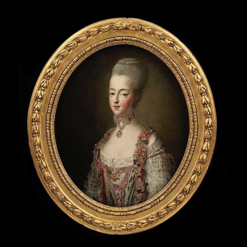 Портрет 1773 года, приписываемый Франсуа-Юберу Друэ, изображающий молодую французскую королеву в официальном придворном платье, украшенном жемчугом, кружевами и цветами:
