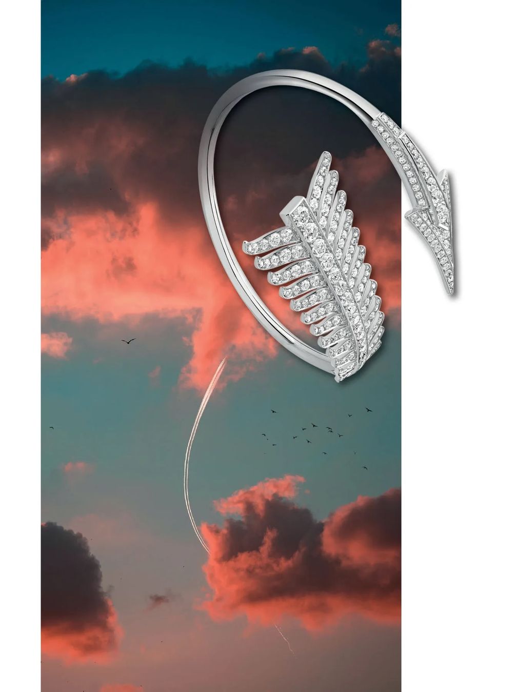 Стрелы – прямые или изогнутые? Брошь Flèche (слева) и кольцо, выполненные из белого золота и украшенные бриллиантами, предлагают вам оба варианта:
