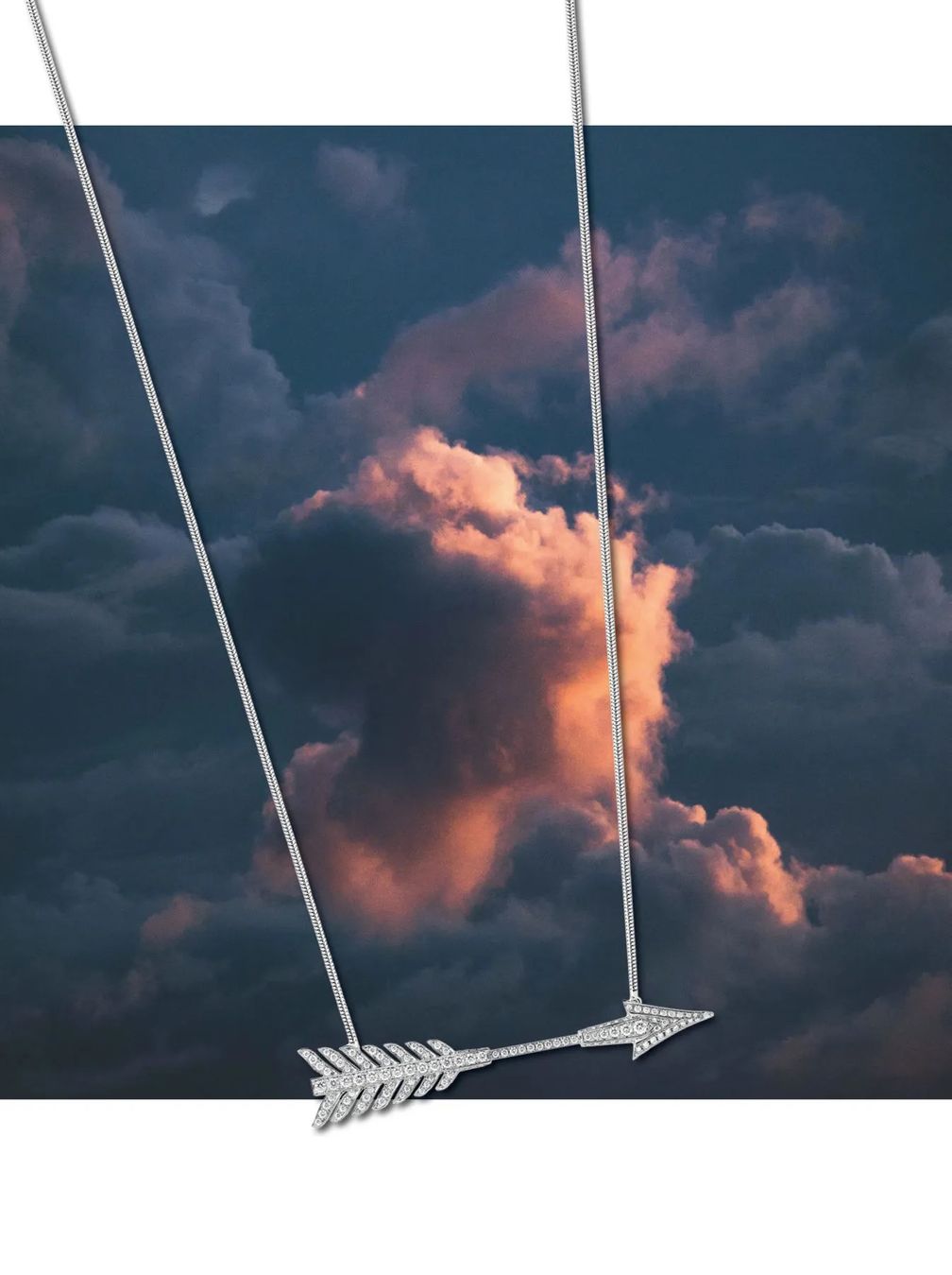 Подвеска вдохновлена архивными образцами Boucheron. Украшенная бриллиантами стрела дополнена цепочкой из белого золота: