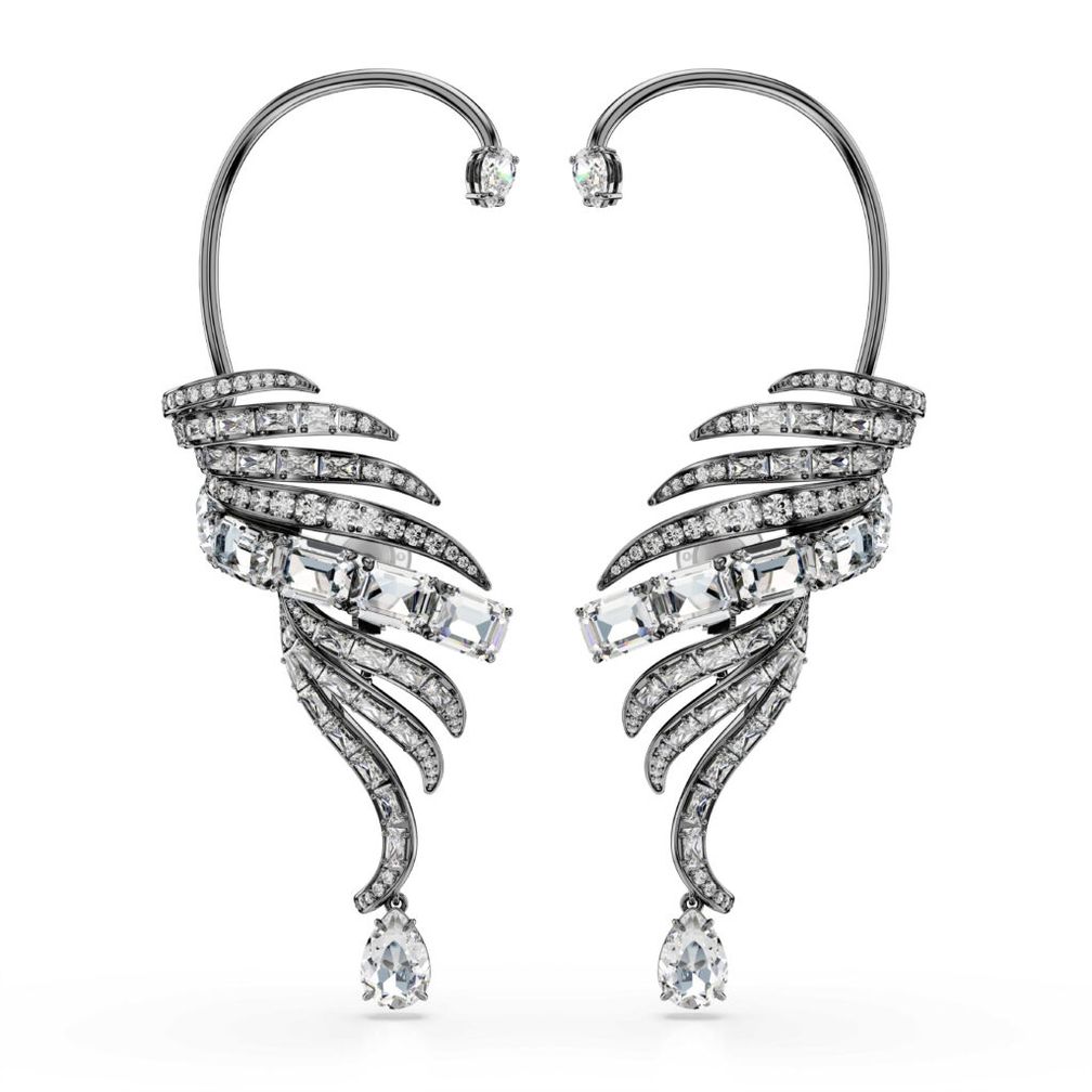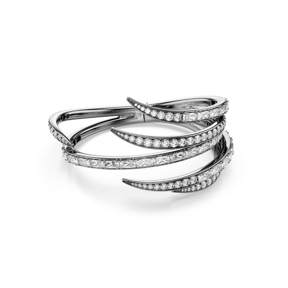 Светящиеся прозрачные кристаллы сочетаются с рутениевыми акцентами, создавая смелые контрасты в архитектурных решениях. Детали в технике паве и сочетание камней разных размеров багетной и смешанной огранки усиливают сияние каждого изделия, а темный рутениевый контур вокруг кристаллов подчеркивает форму перьев.