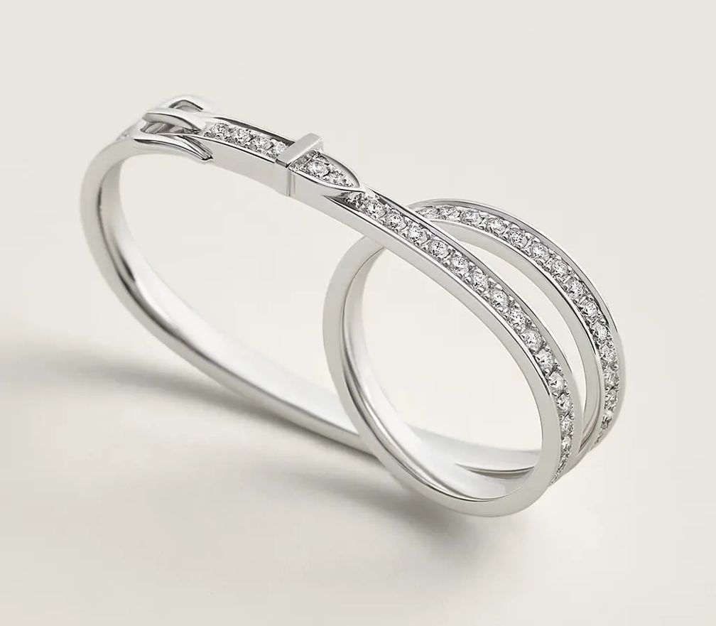 Кольцо на два пальца Etriviere от Hermès, выполненное из белого золота с бриллиантами, – это воплощение современной роскоши (Hermès):