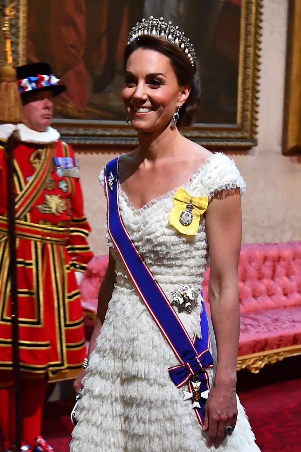 На банкете в честь государственного визита президента Трампа в Великобританию герцогиня Кембриджская воспользовалась своей любимой тиарой, чтобы придать блеск своему наряду. Она сочетала Lover’s Knot с серьгами с сапфирами и бриллиантовой бахромой королевы-матери и своим новым Королевским Викторианским орденом.
