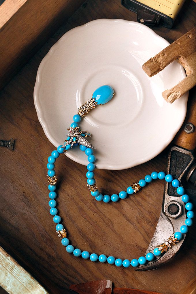 Комплект с танзанитом включает в себя эффектное колье, браслет и серьги. Ожерелье с бирюзой украшает бриллиантовая птица. Она сжимает нити с бирюзой огранки кабошон, подчеркнутой золотыми и бриллиантовыми перьями по всей длине. Изделие венчает эффектная капля из бирюзы. Комплект также включает кулон, брошь и кольцо, каждое из которых неожиданным образом перекликается с культовой птицей.