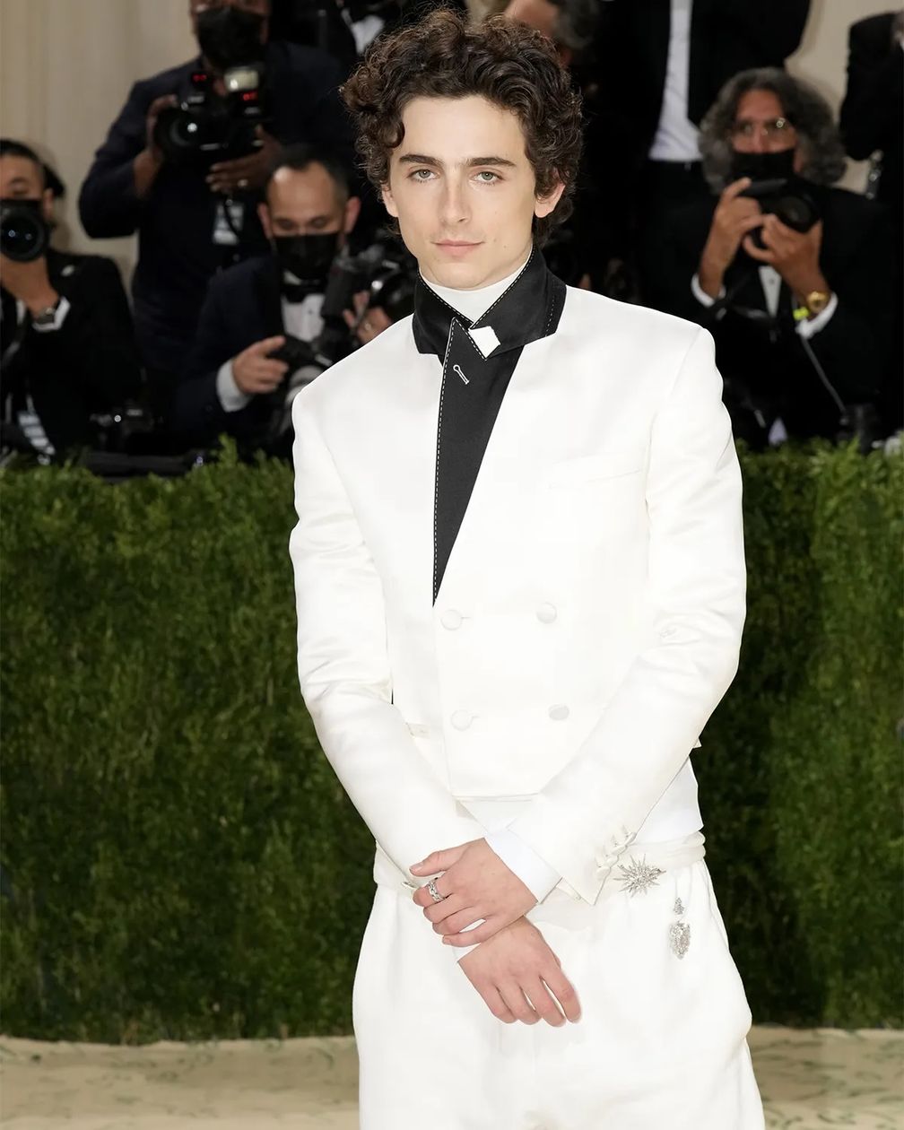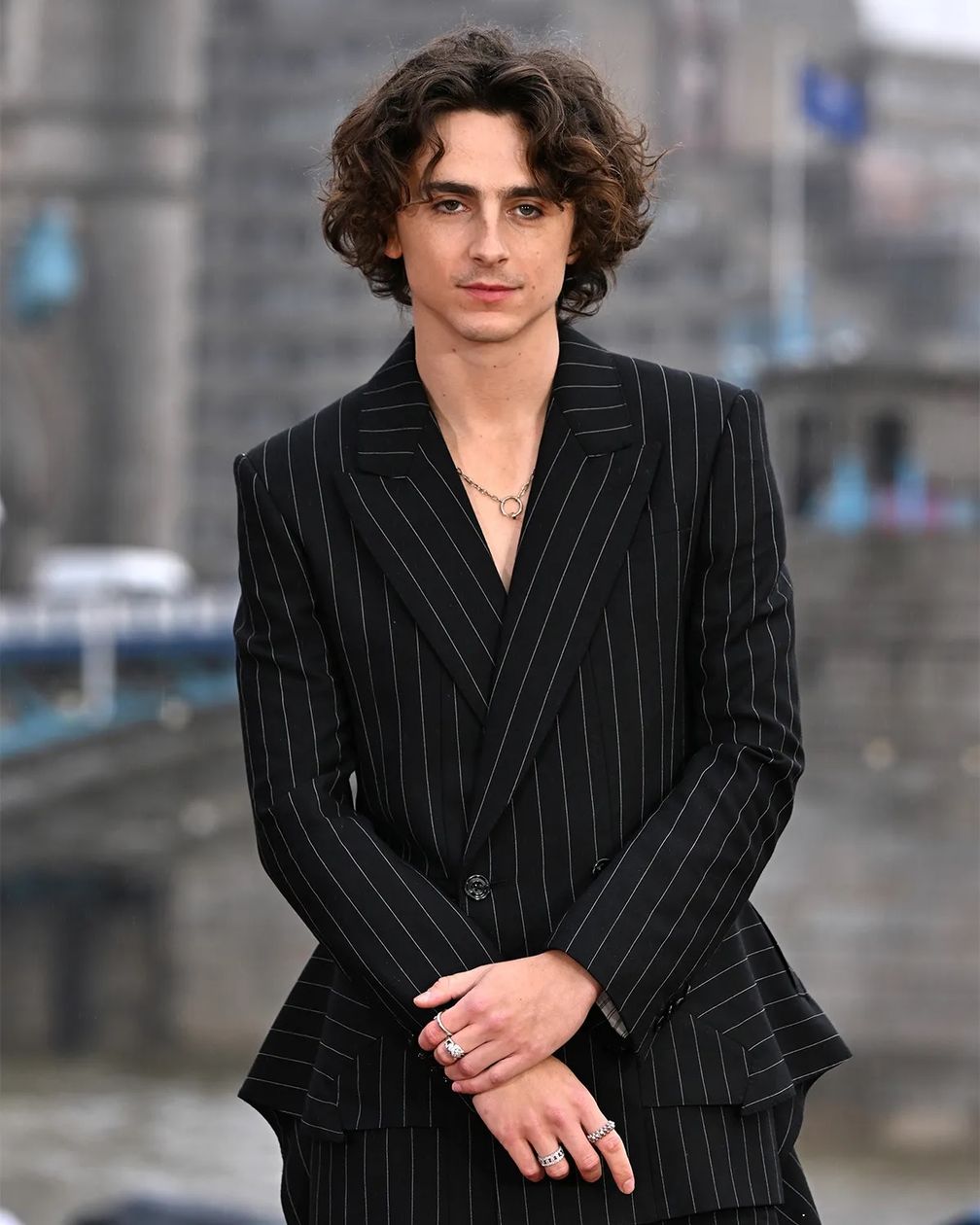 В Лондоне Тимоти выбрал классический костюм в полоску от Alexander McQueen, сшитый на заказ. Рубашки нигде не видно. Чтобы подчеркнуть свой образ, он добавил кольцо с бриллиантом Panthère de Cartier в дополнение к аналогичным кольцам из коллекции Broderie de Cartier, которые он носил в Токио.