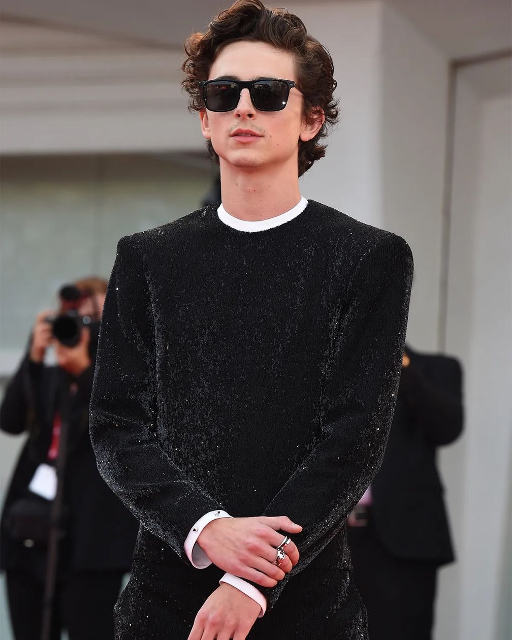На Каннском кинофестивале Тимоти придерживался стиля casualв полностью черном ансамбле от Haider Ackerman, пока дело не дошло до аксессуаров. Хотя их было немного, он неожиданно продел винтажную брошь Cartier через манжету рукава и, конечно, добавил два классических кольца Cartier с бриллиантами и черной керамикой.
