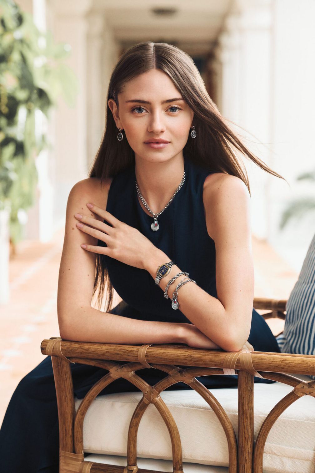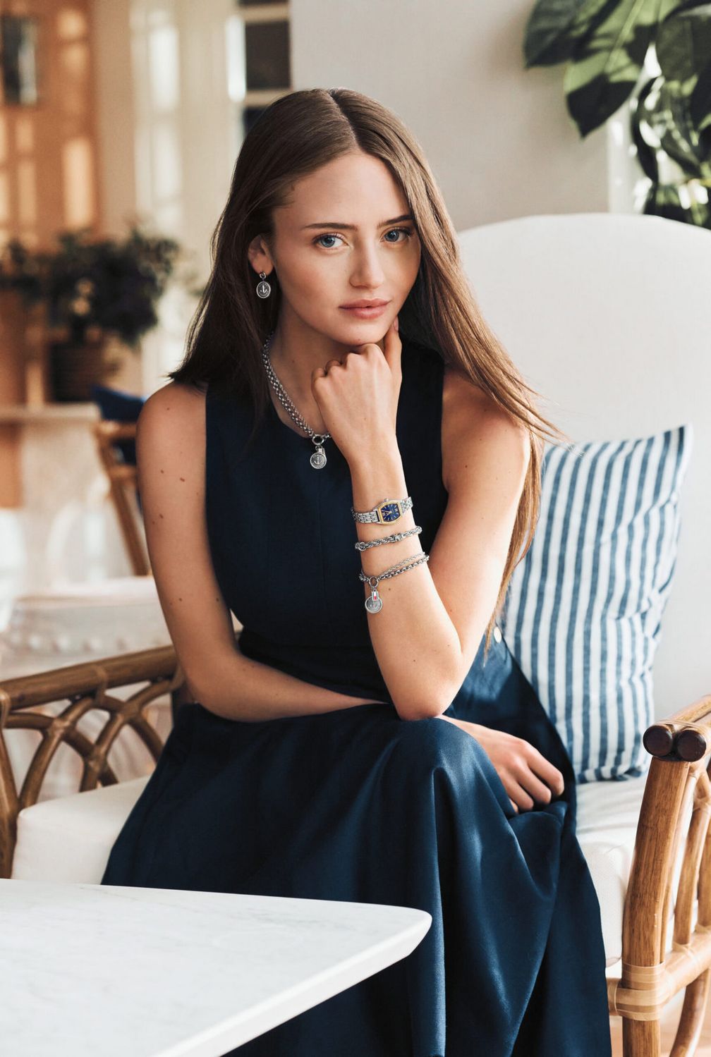 В кампании она сочетает несколько украшений из линий Marina («Марина») и Nautical Charms («Морские амулеты») в многослойный ансамбль, переосмысливающий морские мотивы. Детали в виде якорей, витые канаты и культовые мотивы флагов сочетаются с позолоченными поверхностями — игра символики и летнего настроения, которая продолжается в колье, браслетах и серьгах.