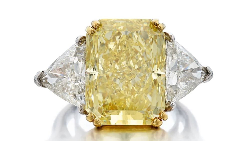 Главным украшением этого кольца является прямоугольный бриллиант чистоты VS1, весом 14,22 карата, насыщенного желтого цвета, расположенный между двумя бриллиантами треугольной формы.