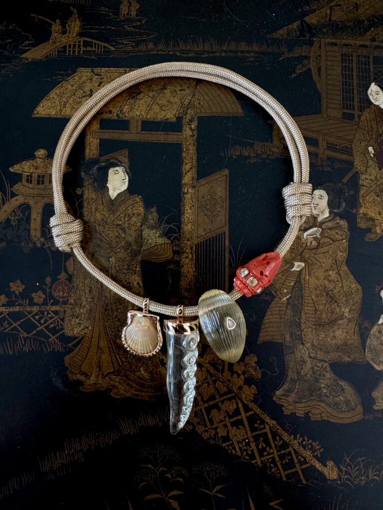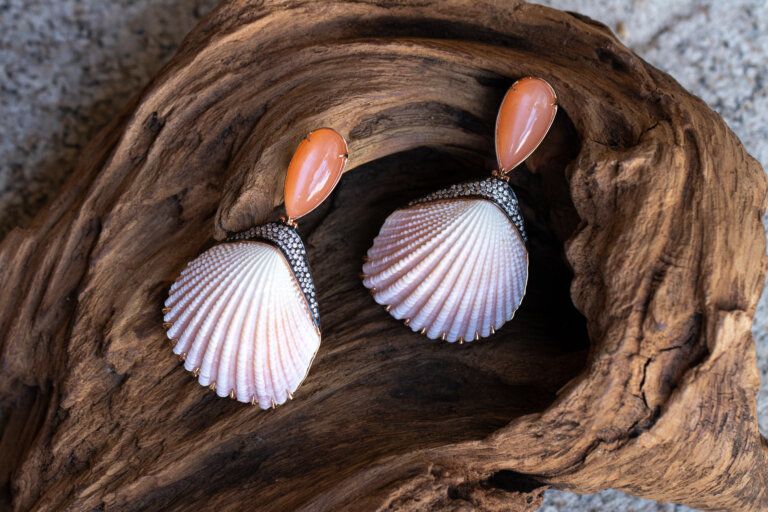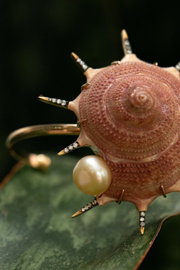 В своих изделиях из ракушек Сильвия придерживается очень легкого подхода. Найдя самые интересные и необычные образцы, созданные матерью-природой, она просто добавляет немного бриллиантов здесь и там, прежде чем вставить их в кольцо, браслет или серьги. Иногда она дополняет ракушки красиво подобранным камнем для цветовой гармонии или контраста.