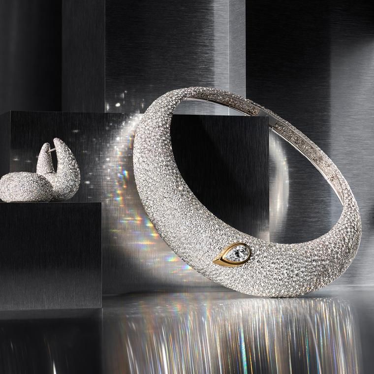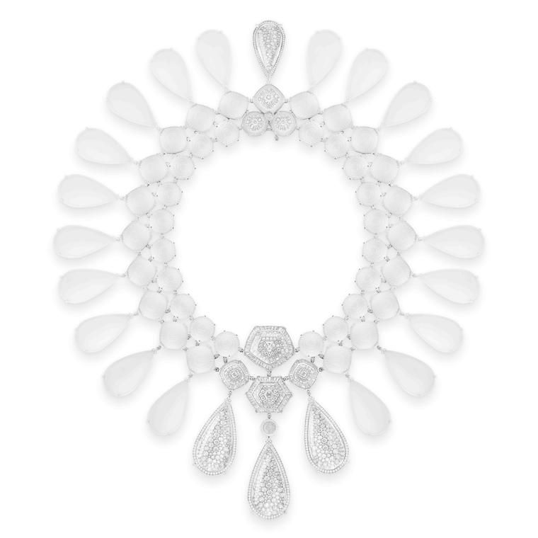 Колье Iceberg от Boucheron из коллекции высокого ювелирного искусства Carte Blanche 2024 года выполнено из белого золота и украшено горным хрусталем и бриллиантами pavé. Вдохновленное мощными водами Исландии, это украшение передает красоту и силу воды: