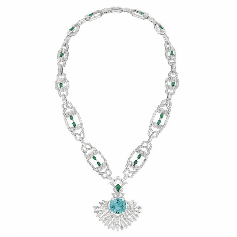 Колье Fantasy Cut от Damiani, посвященное столетию Дома в этом году, украшено изумрудом Muzo весом 63,97 карата в оправе из белого золота и окружено бриллиантами круглой огранки и огранки изумруд: