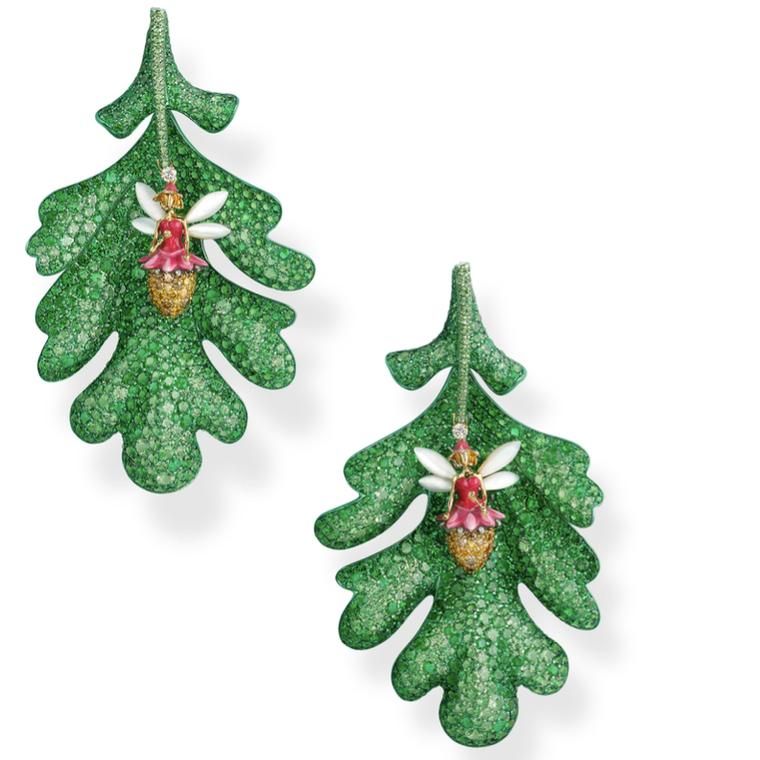 Серьги Chopard в виде дубовых листьев из коллекции Red Carpet 2024 года с изображением фей на каждом желуде, выполненные из этичного 18-каратного розового золота и титана, украшены жемчугом, цаворитами, изумрудами и бриллиантами круглой огранки в оттенках белого, желтого и коньячного цветов: