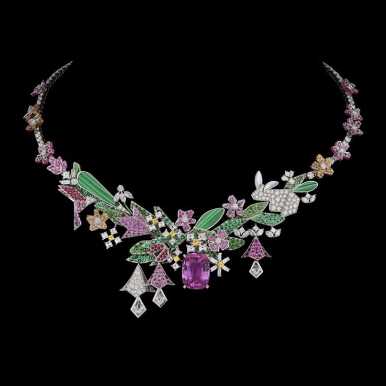 Это колье из коллекции высокого ювелирного искусства Dior Diorama & Diorigami 2024 года от Виктуар де Кастеллан отличается яркими драгоценными камнями и изысканным мастерством исполнения, воспевая красоту природы и исключительное мастерство французского Дома: