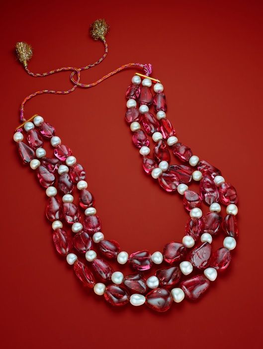 Ожерелье из трех нитей шпинели и природного жемчуга эпохи Великих Моголов. С сорока пятью бусинами из полированной шпинели, сорока восемью круглыми и почти круглыми природными жемчужинами диаметром примерно от 13,20 мм до 9,90 мм, около 1750 года: