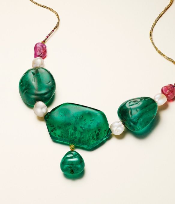 Колье времен Великих Моголов с несколькими драгоценными камнями и изумрудами представляет собой четыре замечательных колумбийских изумруда общим весом почти 800 карат. Эти камни отражают преобразующий период 16-го и 17-го веков, когда находки изумрудов в Колумбии привлекли внимание дворов Османской Турции, Персии Сефевидов и Индии Великих Моголов. Во времена династии Великих Моголов изумруды, подобные этим, стали легендарными, их природное великолепие усиливалось благодаря искусной резьбе и сложной оправе из золота.