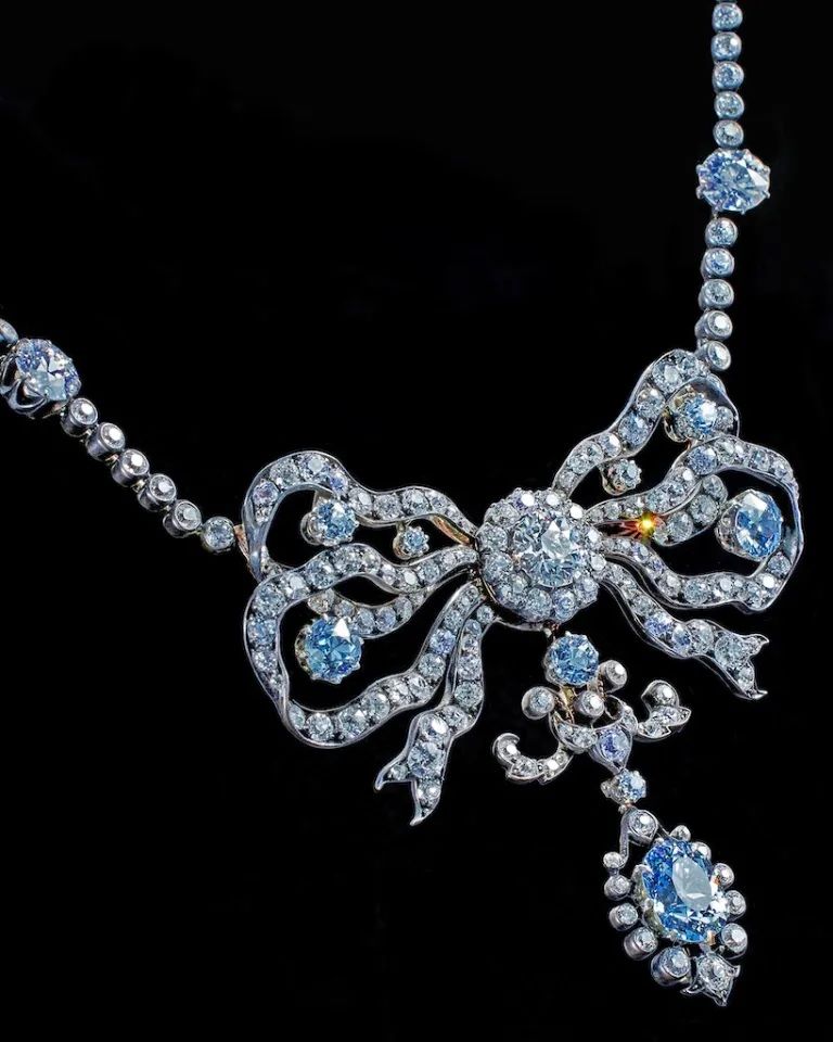 Колье выполнено в эдвардианском стиле и украшено двойным бантом, инкрустированным 243 бесцветными бриллиантами и девятью природными голубыми бриллиантами в оправе из 9-каратного розового золота и серебра. Из примерно 30 карат бриллиантов главным украшением драгоценности является природный голубой бриллиант весом 2,6 карата, подвешенный в центре.