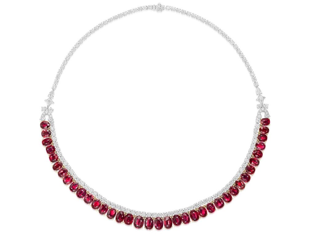 Колье содержит 37 градуированных овальных и формы кушон бирманских рубинов общей массой около 40,35 карата, подвешенных на одной линии бриллиантов круглой и грушевидной огранок. Его стоимость составила $ 178 816, что чуть ниже минимальной оценки в $ 180 000.
