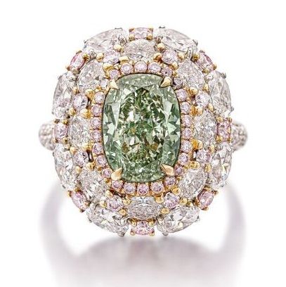 Кольцо с бриллиантом в форме кушон, весом 3,70 карата, интенсивно-зеленого цвета, окруженным розовыми и белыми бриллиантами, имеет максимальную оценку в 11 миллионов гонконгских долларов ($ 1,4 млн).