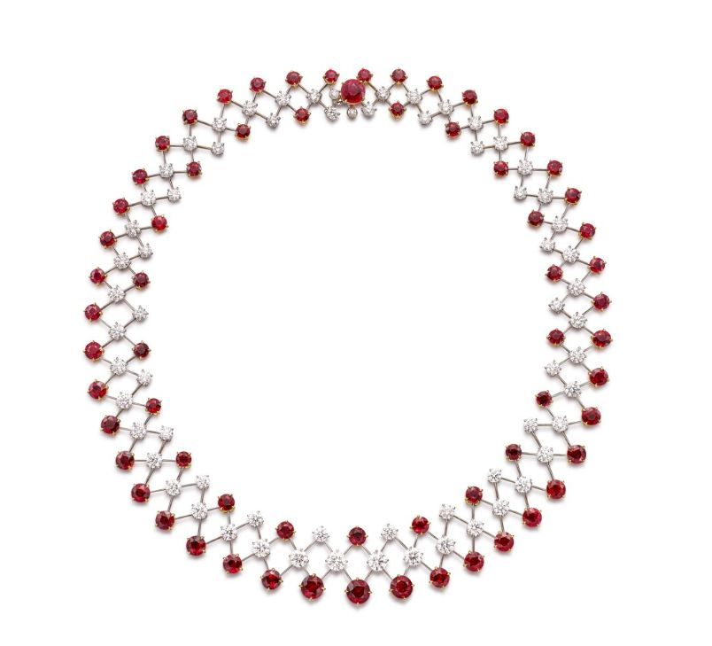 Это ожерелье украшено 65 бирманскими рубинами круглой огранки, общим весом приблизительно 53,80 карата. Из них почти половина драгоценных камней считается камнями цвета «голубиная кровь». Украшение, которое оценивается в 12 миллионов гонконгских долларов ($ 1,5 млн), также содержит 50 бриллиантов весом от 0,30 до 0,90 карата, цвета от D до E и внутренней чистоты от VS1.