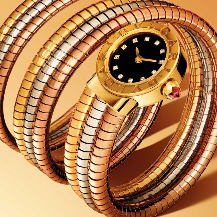 Часы Tubogas от Bulgari состоят из трио спиралей из красного, белого и желтого золота, которые трижды обвиваются вокруг запястья. Циферблат часов выполнен по дизайну Bulgari, а название дважды повторено по кругу безеля.