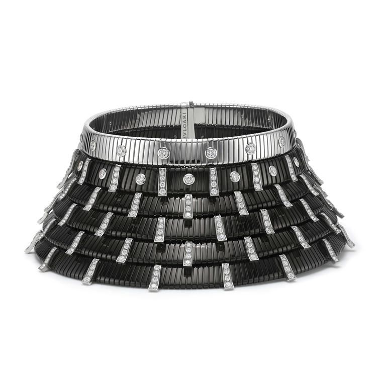 Чокер Bulgari Tubogas Black Eagle из белого золота с покрытием DLC и бриллиантами создает сильный образ для самых смелых любителей драгоценностей. Его сложная конструкция – дело рук высококвалифицированной команды ювелиров Bulgari, которые совершенствовали технику Tubogas на протяжении 5 десятилетий:
