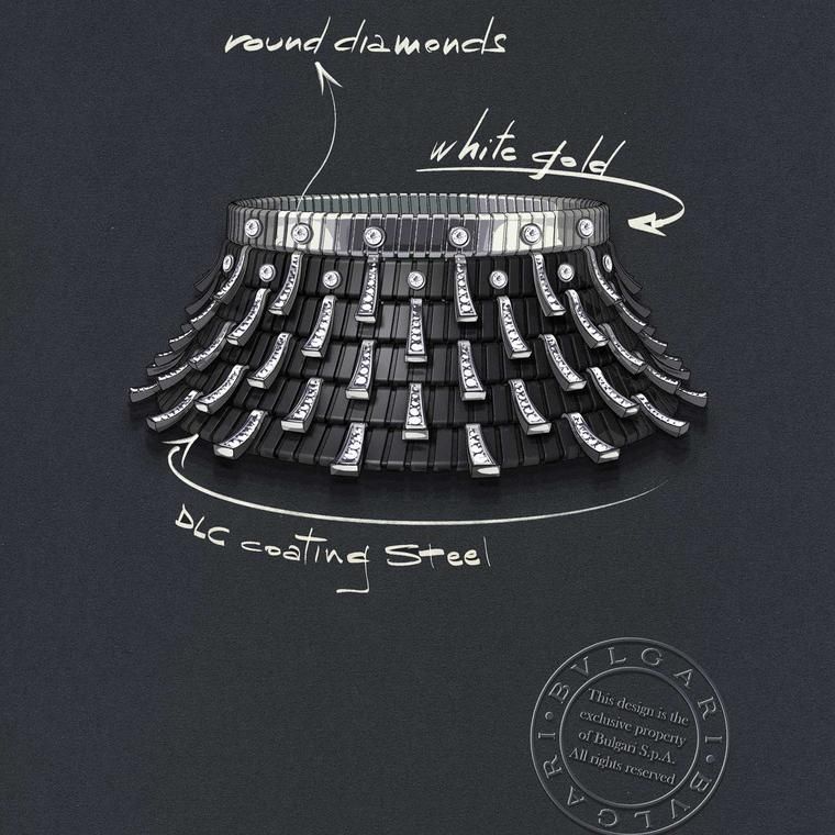 Эскиз Bulgari Tubogas Black Eagle раскрывает всю сложность этого единственного в своем роде ювелирного творения, которое поднимает Tubogas на непостижимую высоту изысканности: