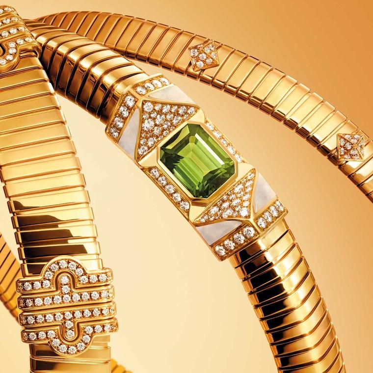 Чистые линии Tubogas позволяют дизайнерам Bulgari создавать новые версии, используя знаменитые мотивы Дома, такие как Parentesi, вдохновленный мостовыми Рима, или богатое наследие драгоценных камней, таких как цаворит в сочетании с перламутром: