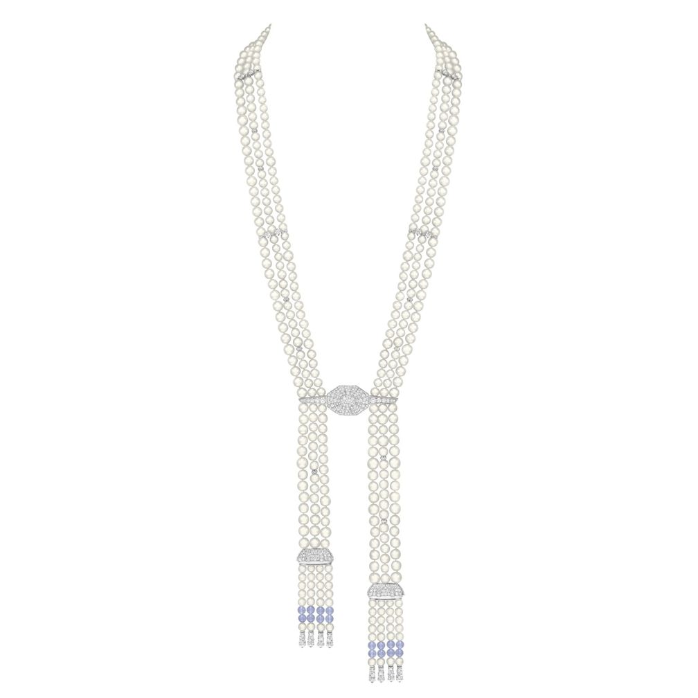 Длинное колье Corolle perlée из белого золота с сапфирами, халцедонами, белым культивированным жемчугом и бриллиантами: