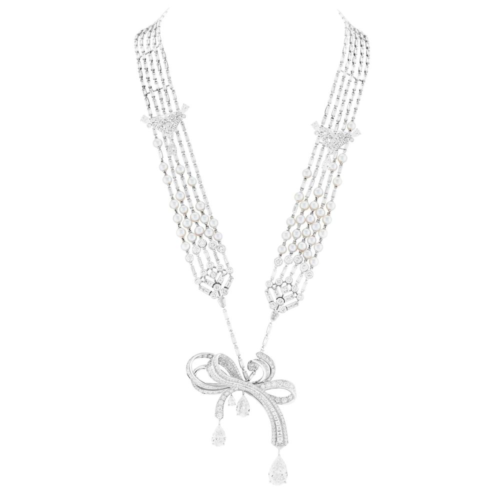 Колье Garofano легко превращается из простого элегантного чокера в более сложное многоуровневое украшение, а колье Volutes d’hiver, вдохновленное вихревыми узорами зимнего ветра, заключенными в сверкающие бриллианты и нежный жемчуг, легко трансформируется из элегантного колье-воротника в полноразмерное оперное колье.