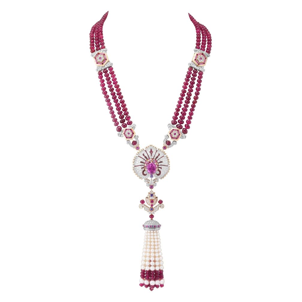 Трансформируемое длинное колье Garofano из 18-каратного белого и розового золота с одним розовым сапфиром овальной огранки весом 10,25 карата, 481 бусиной красной шпинели весом 547,83 карата, цветными сапфирами, рубинами и белым культивированным жемчугом: