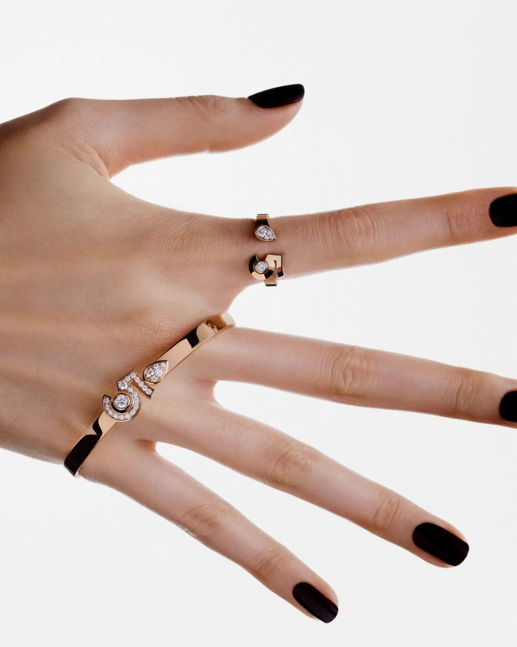 Наконец, давайте не будем забывать о браслетах и кольцах, в частности о смелом браслете Eternal N°5, который изящно застегивается на бриллиант, вставленный в нижнюю часть цифры, что придает ему безупречный вид. Браслет Extrait de N°5 создает более минималистичный образ, имитируя изящество ожерелья Extrait de N°5. Дополните образ кольцом Extrait de N°5. Браслет Eternal N°5 и кольцо Extrait de N°5 дополняют друг друга.