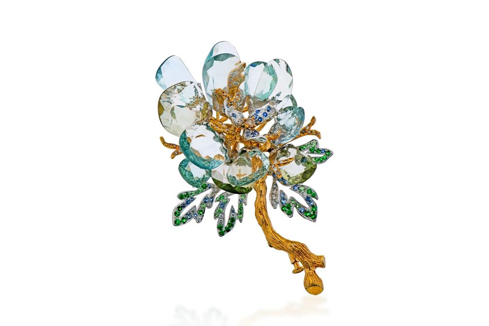 Брошь с аквамаринами и бриллиантами в оправе из 18-каратного золота: