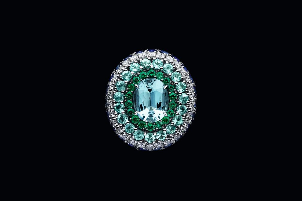 Кольцо из белого золота с бриллиантами, аквамарином, изумрудами, сапфирами и турмалинами параиба: