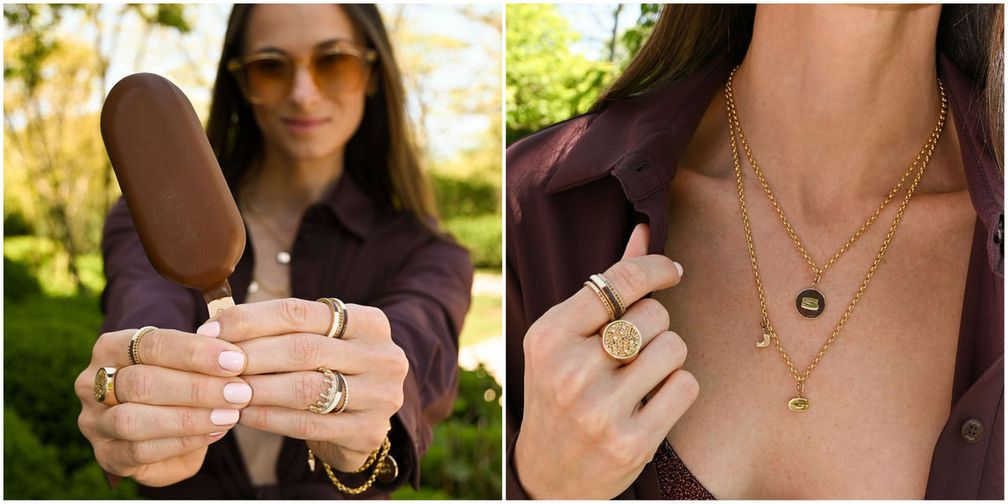 Ассортимент включает кольцо с эмалью шоколадного и ванильного цвета, которое имитирует классическое мороженое Magnum. Кольцо Caramel & Vanilla Pave украшено карамельными и белыми бриллиантами, а кольцо Melt состоит из полосы 14-каратного золота и полосы бриллиантов в паве.