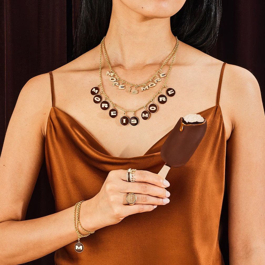 Стефани Готлиб (Stephanie Gottlieb) в ювелирном деле — то же, что Magnum в мире мороженого. Шоколатье мороженого и хранитель очаровательных ювелирных украшений объединили свои усилия, чтобы потворствовать максималистскому мышлению. Благодаря знаменитому дизайнеру украшений Стефани Готлиб, эти декадентские угощения перекочевывают из ваших рук на пальцы и шею. Коллекция украшений More is More черпает вдохновение в легендарных многослойных плитках мороженого Magnum.