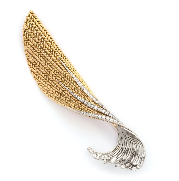 Брошь Feather Пьера Стерле из 18-каратного золота и платины с бриллиантами, около 1950 года, из коллекции A La Vieille Russie (A La Vieille Russie):