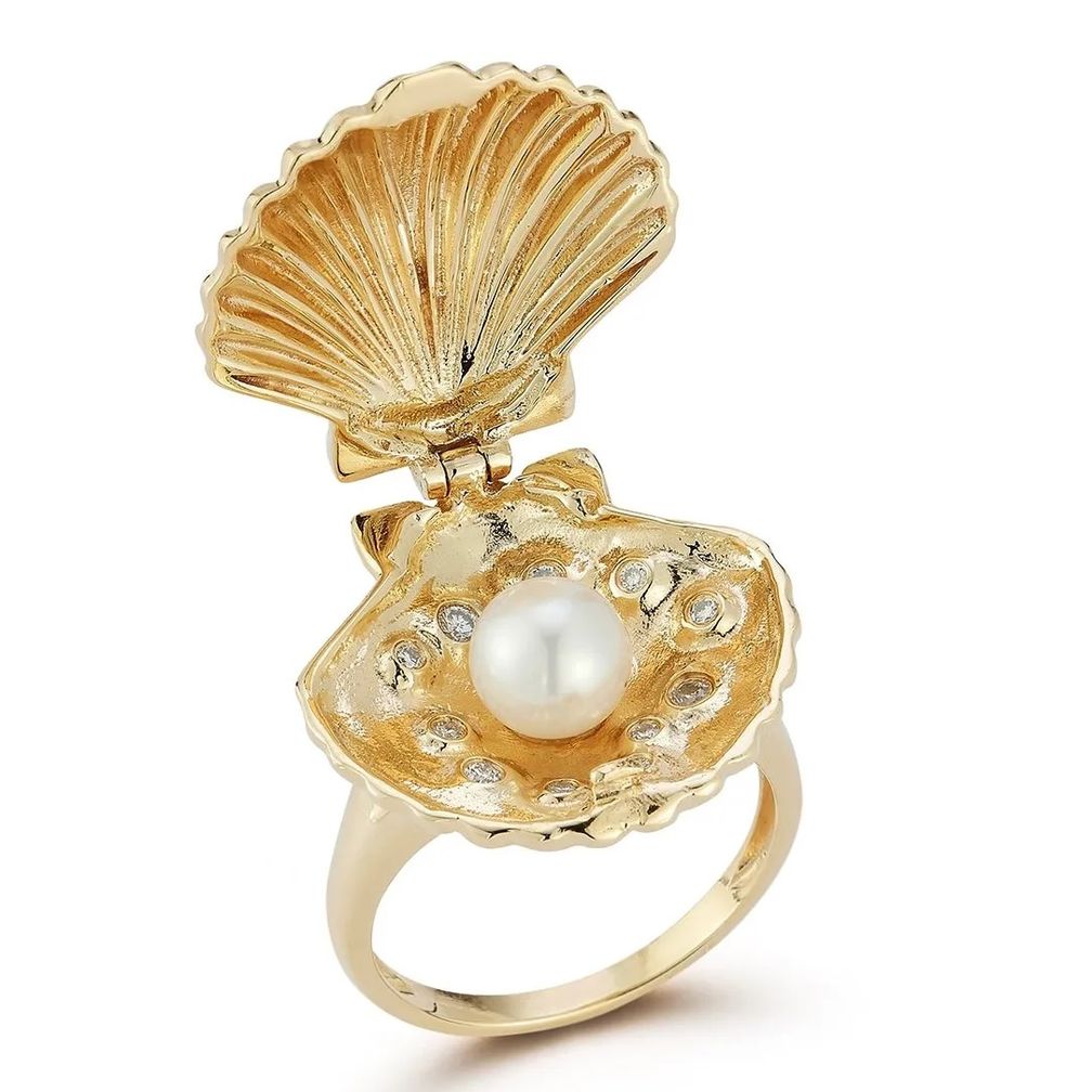 Изысканное кольцо Lady Venus – это великолепное сочетание артистизма и мастерства исполнения, выполненное с механизмом открывания в виде раковины-гребешка и надежной застежкой-защелкой. Кольцо из 14-каратного золота распахивается, открывая взору культивированную жемчужину, заключенную в оправу из природных бриллиантов.