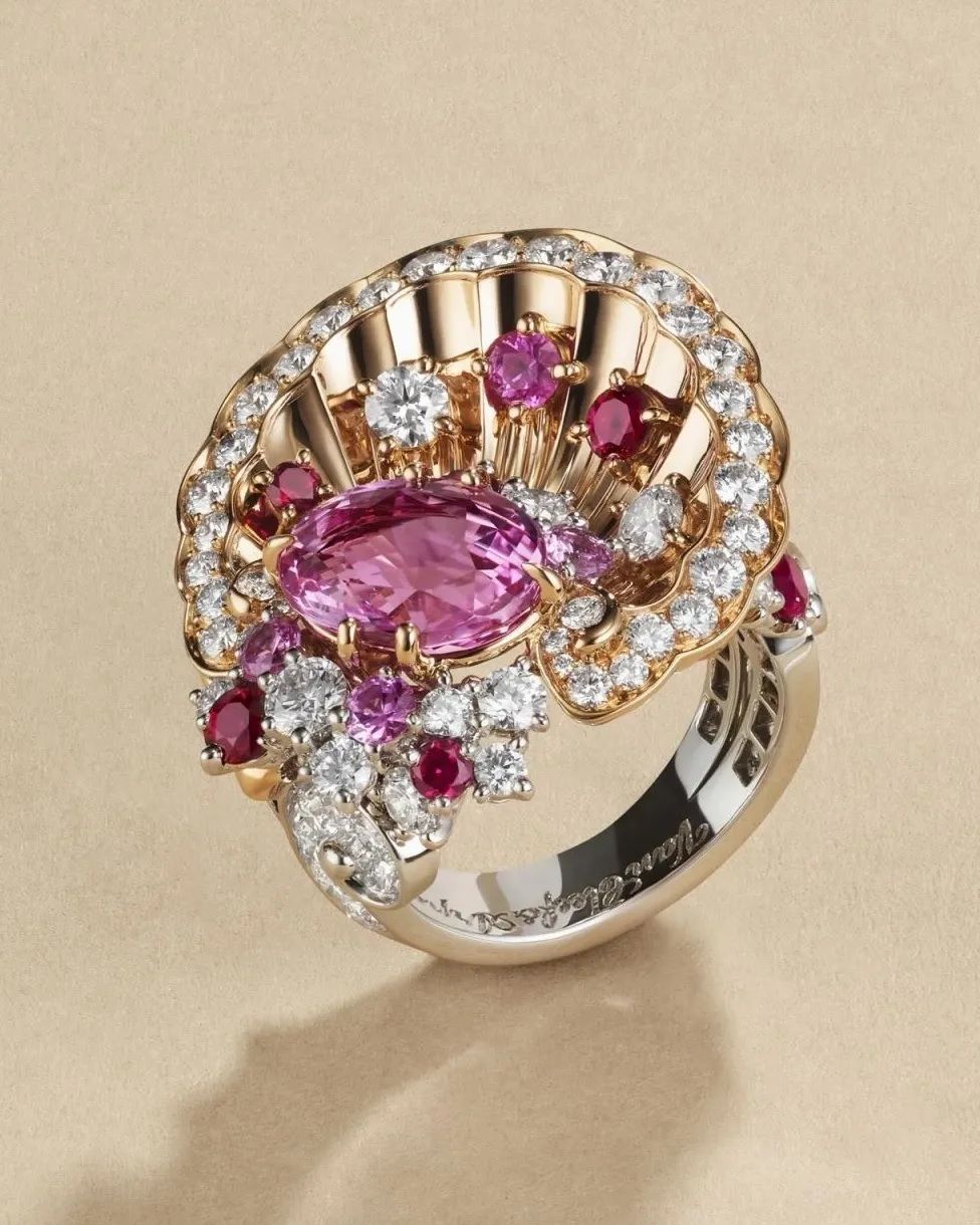 Кольцо Van Cleef & Arpels Ode à l’Amour из розового и белого золота с овальным сапфиром, весом 4,04 карата, рубинами, розовыми сапфирами и бриллиантами (Inès Dieleman):