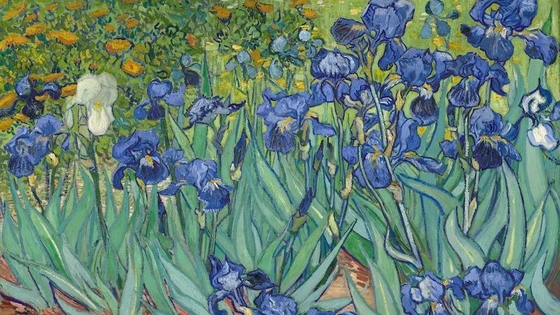 Голландский художник-постимпрессионист Винсент ван Гог начал писать маслом «Ирисы» в 1889 году, в свой первый полноценный рабочий день в психиатрической лечебнице в Сен-Реми-де-Прованс, Франция. Он начал рисовать цветы, растущие в саду больницы. Яркие, цветущие ирисы оживают благодаря динамичным мазкам кисти, выражая оптимизм по поводу его решения лечь в больницу.