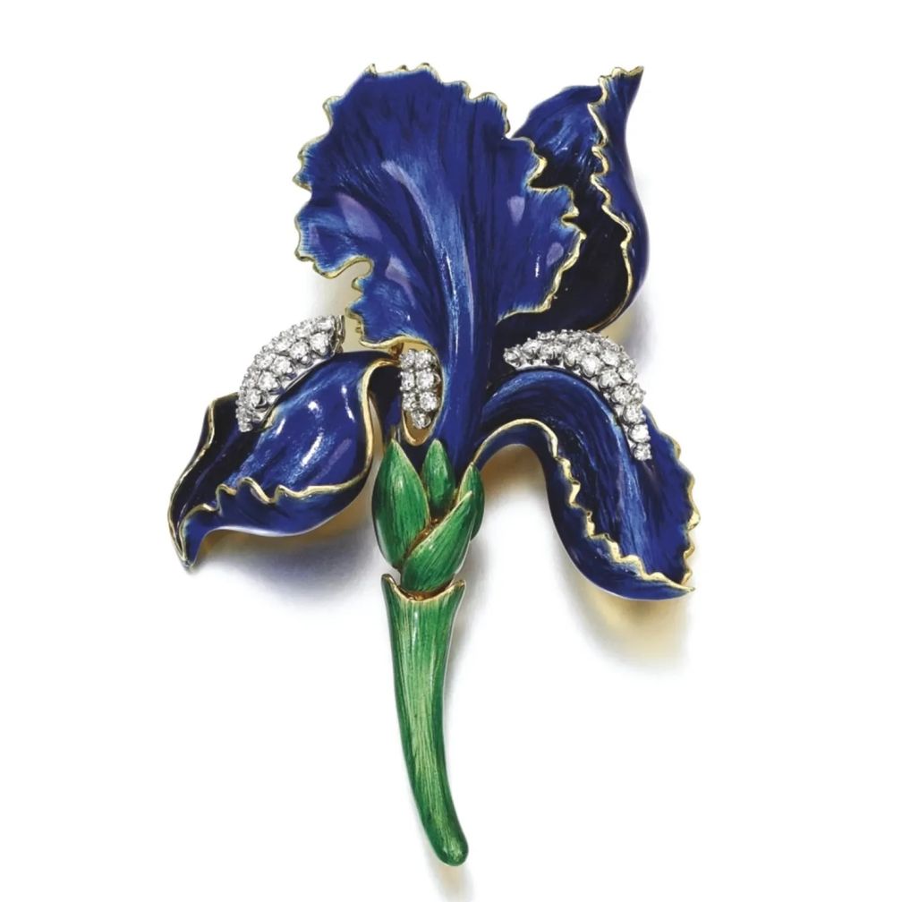 Брошь Iris от американского ювелирного Дома класса люкс David Webb органично вписалась бы в картину. Она выполнена из синей и зеленой эмали basse taille и украшена природными бриллиантами бриллиантовой огранки весом от 2 до 2,5 карат на лепестках.