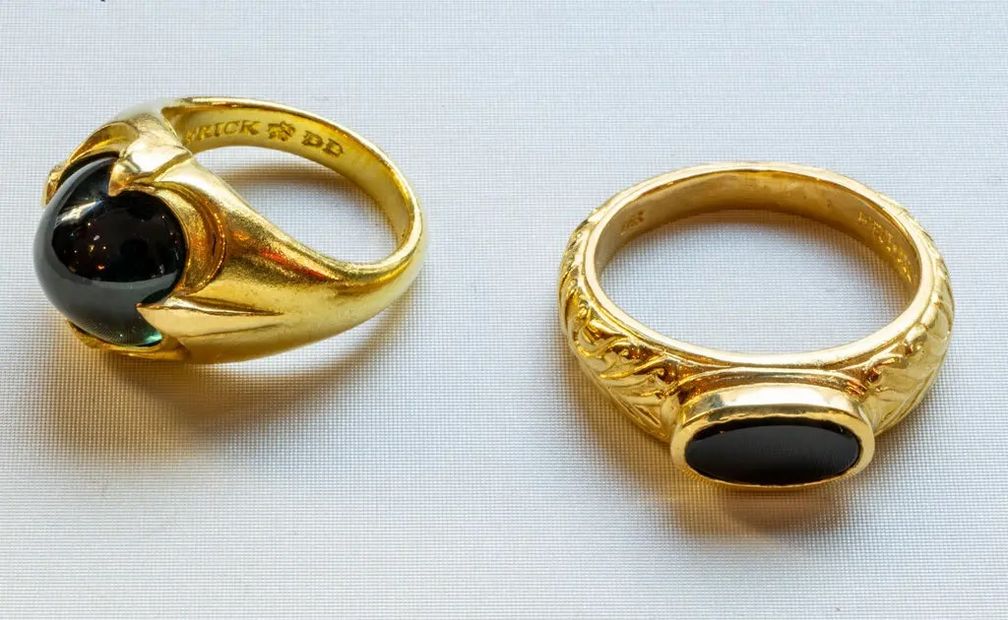 Два кольца, вдохновленные картинами Ганса Гольбейна Младшего; одно слева – «Портретом Томаса Кромвеля», а другое справа – «Портретом сэра Томаса Мора» (Katherine Marks for The New York Times):