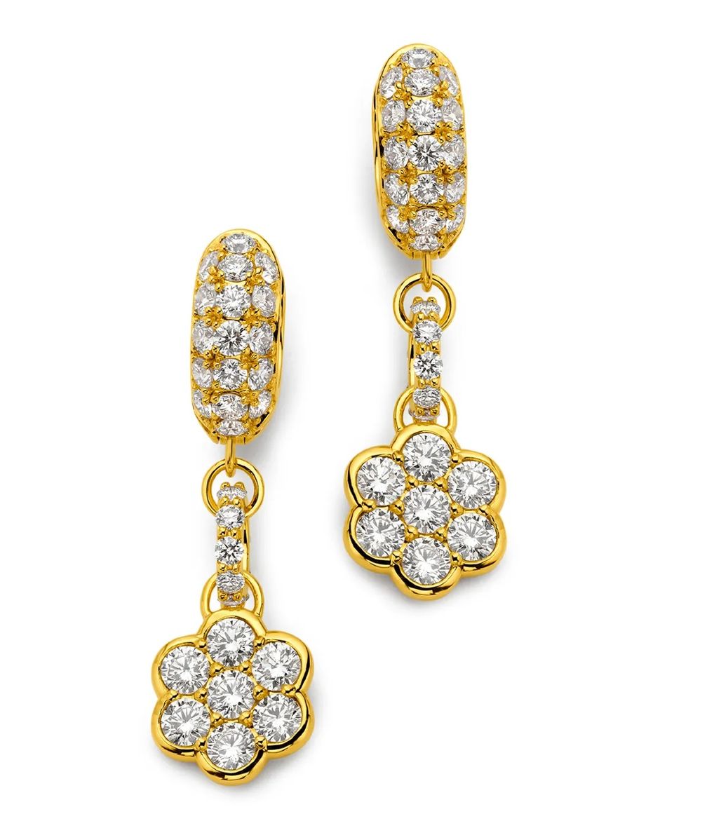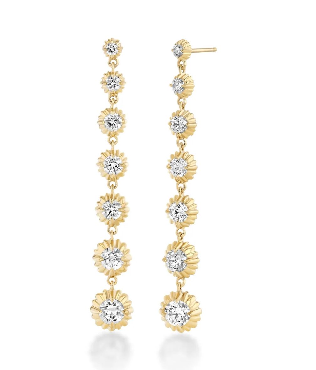 Ищете более длинные серьги? У Lizzie Mandler есть великолепная пара из 7 бриллиантовых капель в оправе, напоминающей подсолнухи, в оттенках желтого, белого и розового золота.