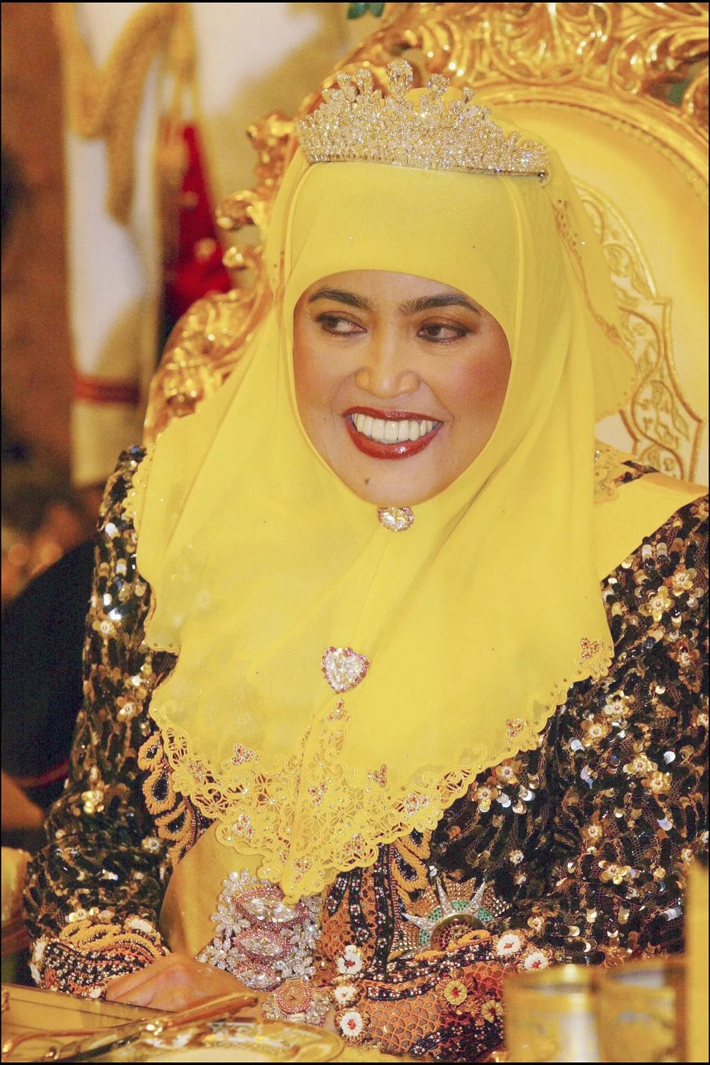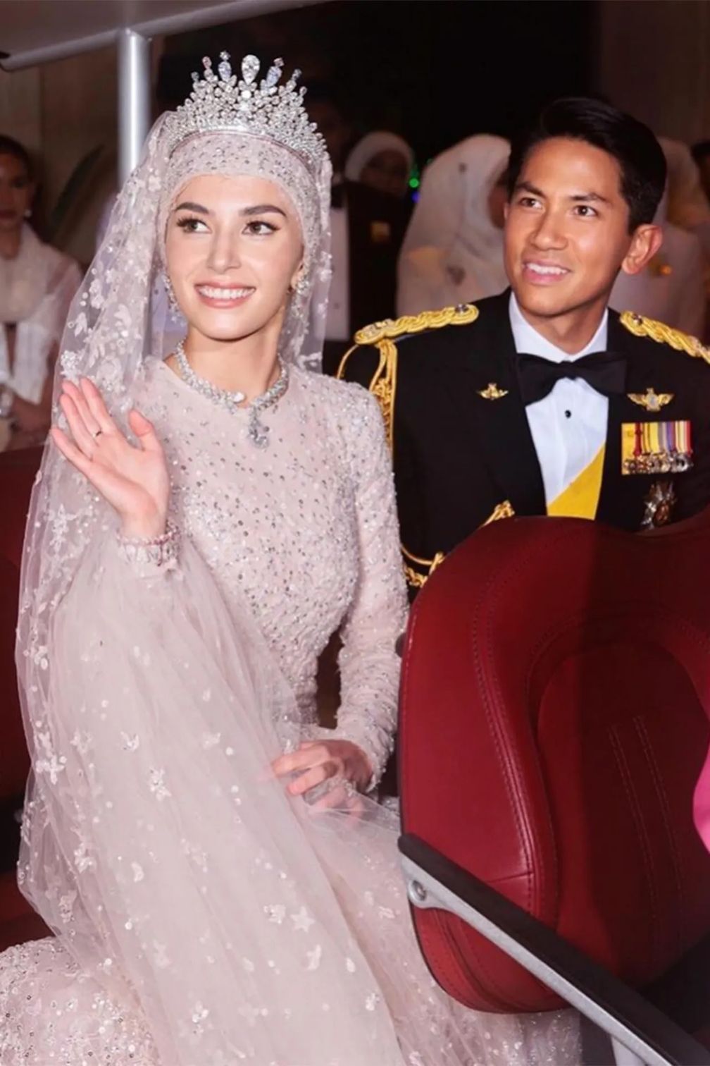 Но самой эффектной, конечно, была бриллиантовая тиара. Впервые ее можно было увидеть на принцессе Аземе, сестре принца Матина, на ее свадьбе с принцем Бахаром в январе 2023 года. Тиара создана на заказ сингапурским ювелиром Flower Diamond, ее стоимость оценивается в 10 миллионов фунтов стерлингов. По оценкам, она украшена 838 бриллиантами общим весом 132 карата, оправленными в белое золото. На создание изделия ушло восемь месяцев.