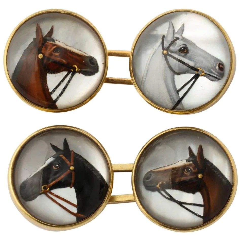 Эссекский хрусталь, часто изображающий лошадей и домашних животных, появился в Англии в XIX веке. Он изготавливался путем вырезания изображения на плоской задней стороне кристалла в форме кабошона, нанесения эмали и закрепления перламутровой или золотой подложкой. Эти запонки начала XX века, возможно, изображают четырех животных из конюшни первоначального владельца украшения.